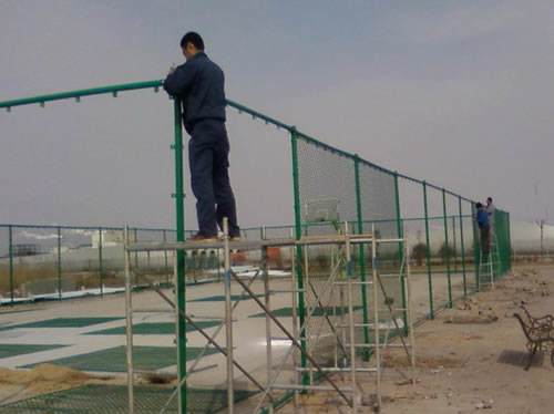 (1) 室外籃球場(chǎng)圍網(wǎng)制安:訂購(gòu)標(biāo)準(zhǔn)尺寸立柱4M高75鍍鋅管(管壁2.2MM)、橫桿3M長(zhǎng)60鍍鋅管(管壁2.0MM)圍網(wǎng)采用套塑圍,顏色為墨綠色,圍網(wǎng)高度為4米,網(wǎng)眼尺寸為45mm×45mm,網(wǎng)線徑為3.6mm。室外籃球場(chǎng)圍網(wǎng)立柱上、下橫桿采用鏍栓制安,訂購(gòu)立柱高度為4米,φ75mm鍍鋅圓管,上、下橫桿為φ60mm鍍鋅圓管,球場(chǎng)入門由φ60mm圓管鏍栓制安。